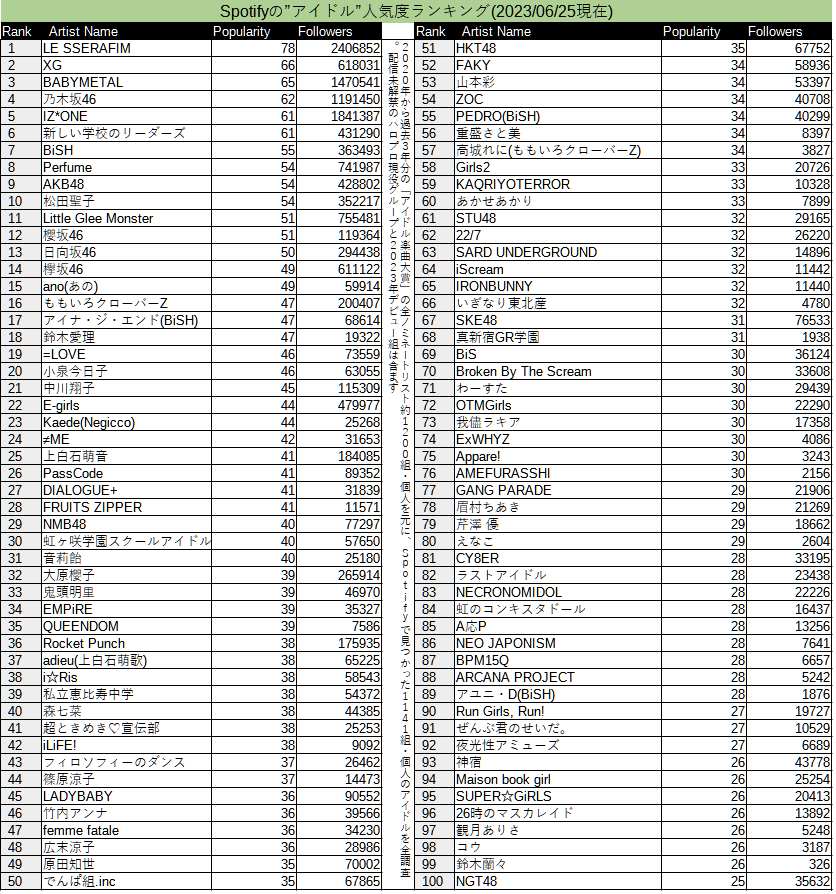 Spotifyのアイドル人気度ランキング