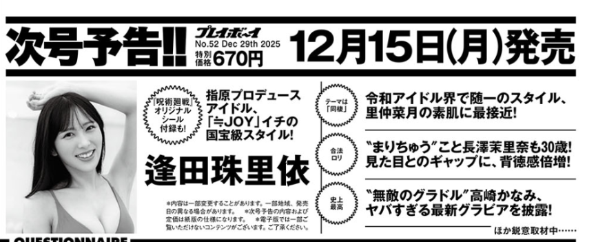 [ニアジョイ] 逢田珠里依表紙の『週刊プレイボーイ』次号予告が到着